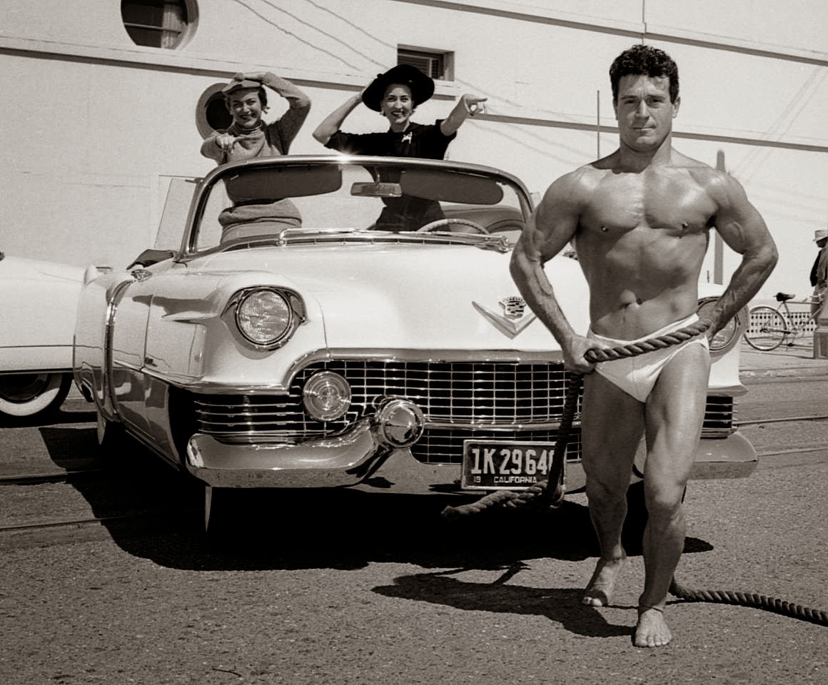 No...let's keep going back further...back to the 60's, when American housewives were too busy making babies and keeping house to get out and hit the gym...besides, back then, gyms were dreary, noisy sweaty places filled with grunting, sweaty men. What to do? A personal trainer? Pretty much unheard of back then...but through the magic of Television...Jack LaLanne to the rescue!